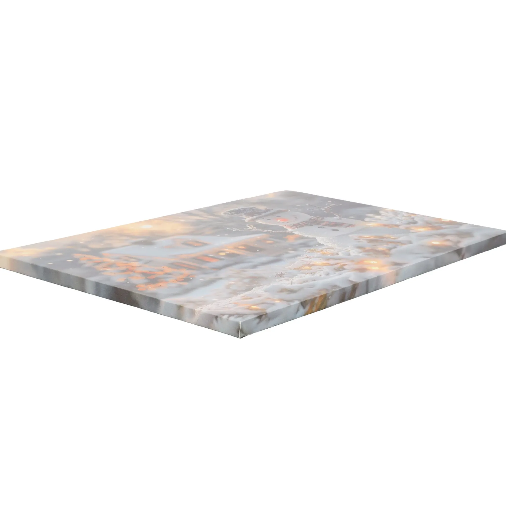 Schilderij met LED-verlichting en afbeelding van een sneeuwman voor een verlichte winterse woning, formaat 60 x 40 cm. Geeft een warm en sfeervol lichtaccent aan de muur.