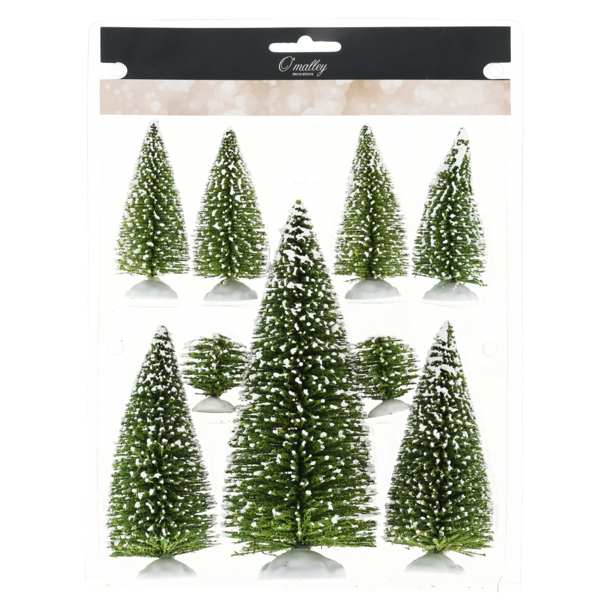 Deze set van negen groene mini-kerstboompjes met sneeuwlaagje is perfect voor het versieren van je kerstdorp of winterdiorama. De boompjes hebben verschillende hoogtes en staan stevig op een witte voet. Gemaakt van kunststof met realistische takjes voor een natuurlijke uitstraling. Ideaal als decoratie tijdens de feestdagen.