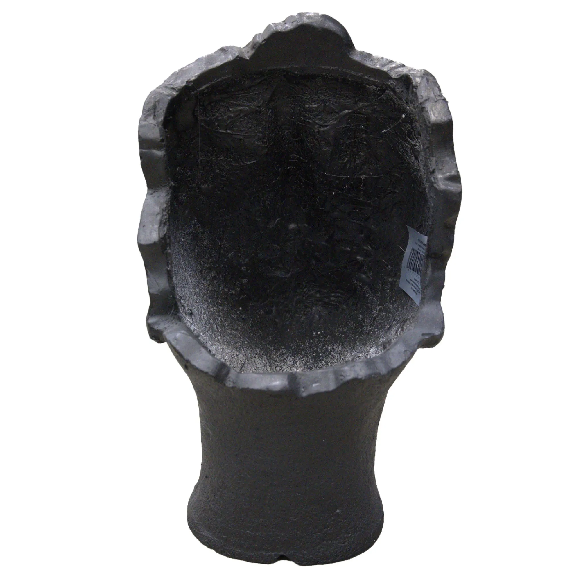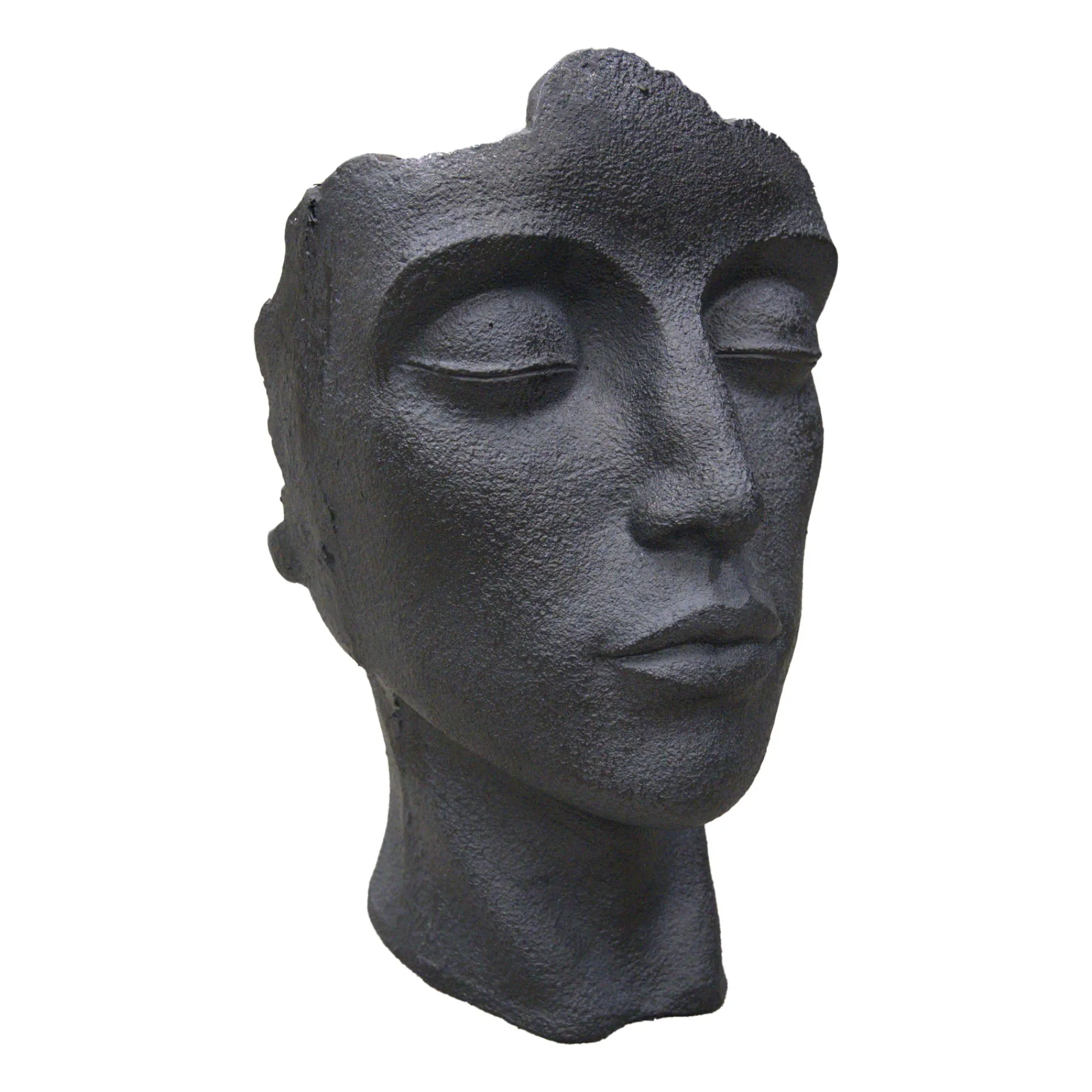 Decoratieve bloempot in de vorm van een gestileerd gezicht met gesloten ogen en onregelmatige bovenrand. Combineert kunst met natuur en is een eyecatcher in elke tuin. Het heeft een fijne structuur, matte zwarte afwerking en een plant met overhangend groen maakt het een sfeervol geheel. Verkrijgbaar in verschillende kleuren, maar ook leuk om te combineren met andere antracietkleurige beelden en bloempotten uit onze collectie.