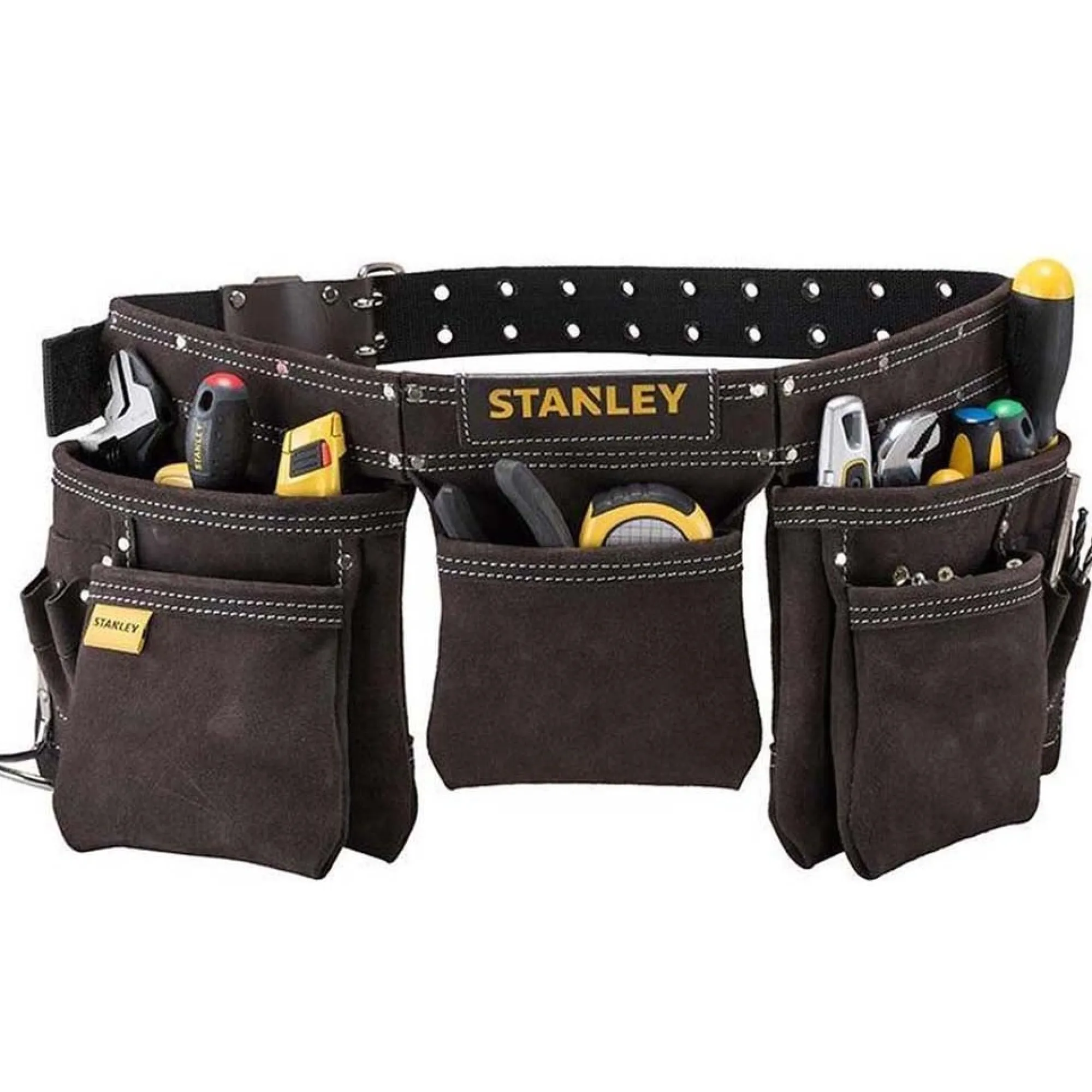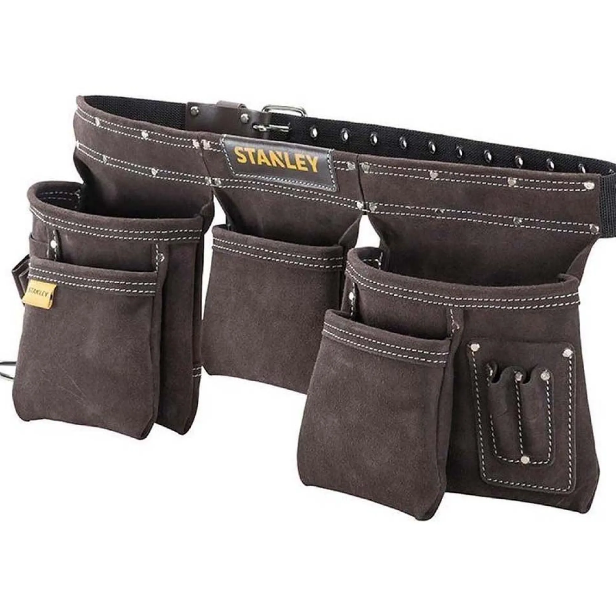 De STANLEY lederen dubbele riem gereedschapsschort is ontworpen om al je gereedschap binnen handbereik te houden tijdens het werk. Het is gemaakt van stevig buffelleer, dubbel gestikt en geklonken voor extra duurzaamheid. Met meerdere zakken en een geïntegreerde hamerlus biedt het schort een praktische en georganiseerde werkoplossing. De verstelbare riem past zich aan verschillende maten aan, zodat comfort gegarandeerd is.