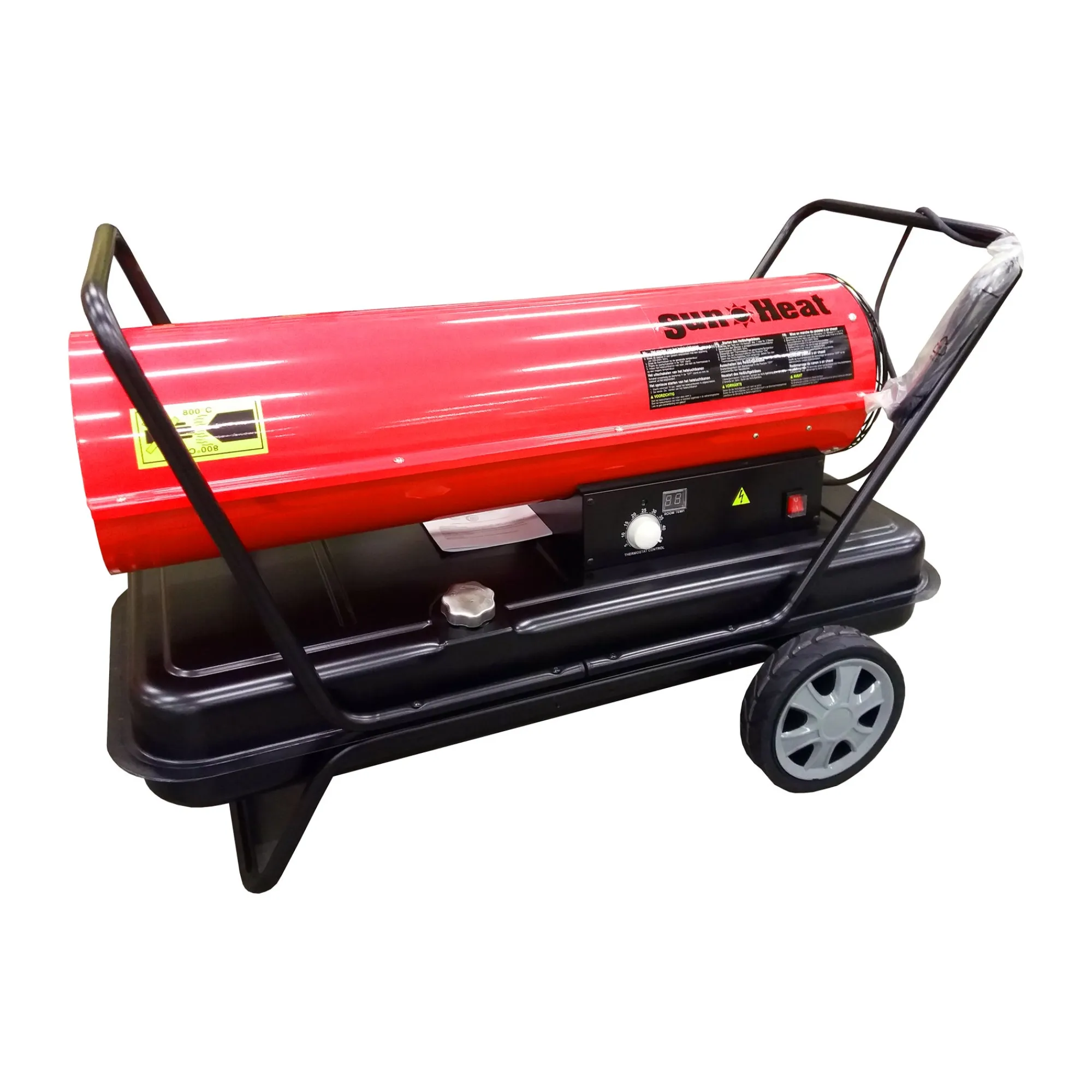 Met een vermogen van 50.000 W is dit krachtige Sun Heat heteluchtkanon ideaal voor het verwarmen, drogen en beschermen van geventileerde ruimtes. Het apparaat is voorzien van een thermostaat, een kamertemperatuurscherm en wielen voor eenvoudig transport. Werkt op petroleum of diesel.