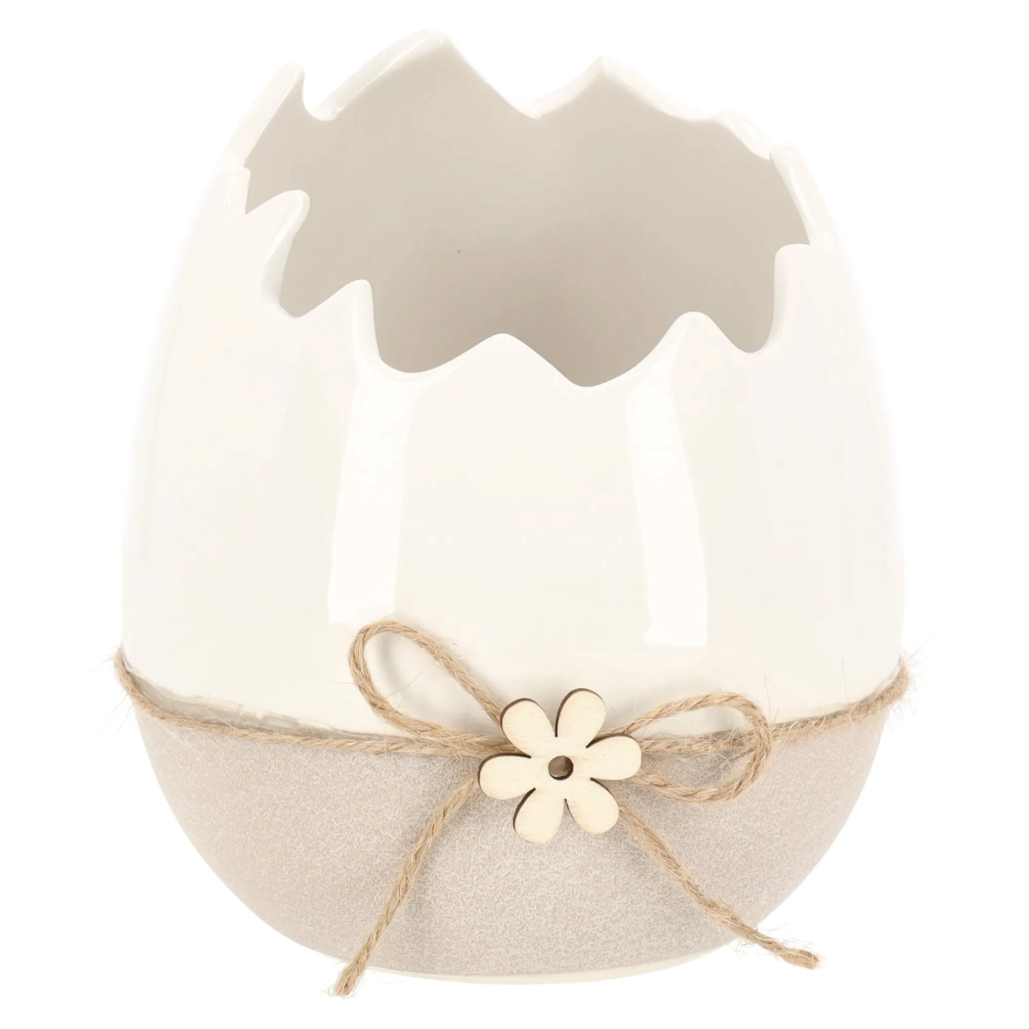 Deze keramieken pot in de vorm van een ei heeft een zachte, neutrale uitstraling. De rand is speels afgewerkt en het touwtje met bloemdetail geeft het geheel een subtiel decoratief accent, geschikt voor kleine planten of als seizoensdecoratie.