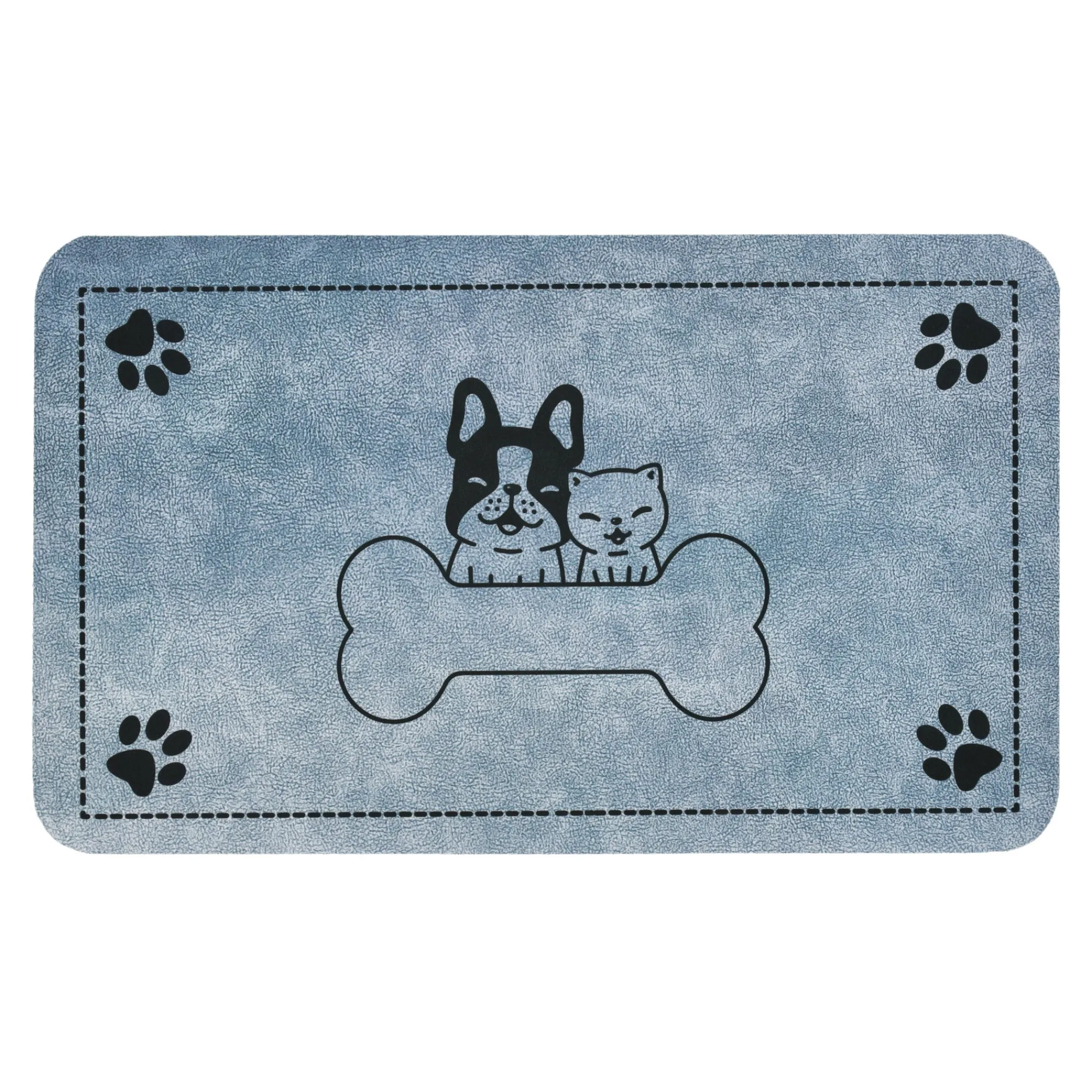Deze leuke placemat met hond en kat is perfect voor onder de voer- en drinkbakken van je huisdieren. De blauwe mat heeft een vrolijk design met pootafdrukken en een groot bot in het midden. Gemaakt van stevig kunststof dat eenvoudig schoon te maken is met een vochtige doek. Ideaal om je vloer netjes te houden tijdens het eten van je hond of kat.
